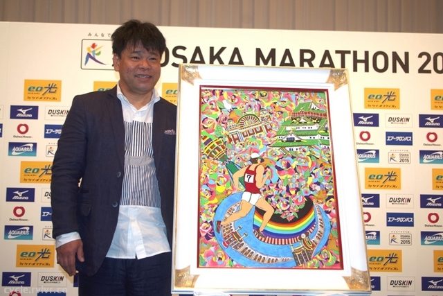 10月25日に開催する第5回大阪マラソンのチャリティアンバサダーのひとりに就任した画家のジミー大西さん。制作した大阪マラソンのイメージ絵画「駆ける」が6月12日、大阪マラソン組織委員会の記者会見で公開された。