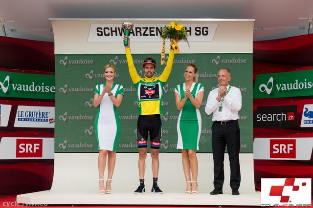 2015年ツール・ド・スイス、6月16日の第4ステージ。オランダのトム・ドゥムラン(ジャイアント・アルペシン)はペーター・サガン(ティンコフ・サクソ)の猛追を受けながらも辛くもリーダージャージを守った。