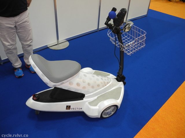 「もっとカッコいいものがあってもいいのではないか」と斬新な形のシニアカーを出品したのがベクトル(本社・神奈川県川崎市)だ。現在、大学などで実証実験を行っており、来年発売する予定だという。
