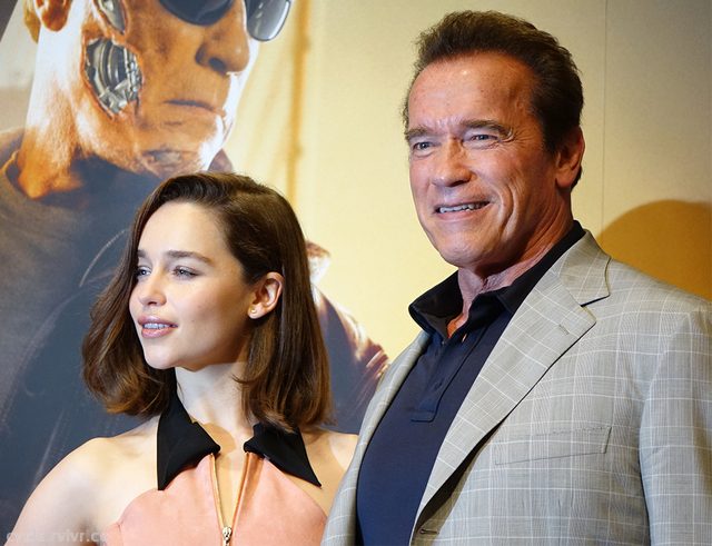 7月10日公開の映画『ターミネーター:新起動/ジェニシス』。5日、シリーズを通し主演を務めたアーノルド・シュワルツェネッガーと、同作のヒロイン、サラ・コナー役のエミリア・クラークが来日、都内で会見を行った。